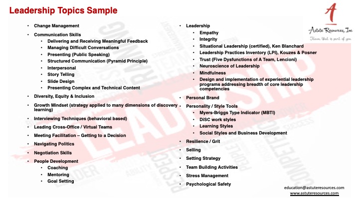 Our Standard training sessions are 1hr and cover a wide variety of topics for individual professional skills development to leadership development. Below is a sample list of topics. Each of these topics can be customized for specific audience and expected outcomes.